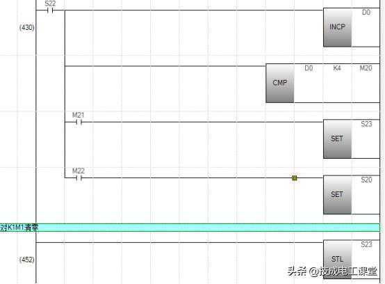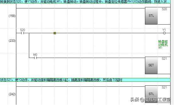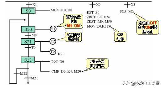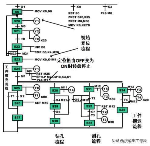 在任何时候,若按下停止按钮STOP(X0),则由复位指令RST复位状态S0,由区间指令ZRST复位状态S20-S26、M0-M30,由MOV指令对Y0-Y2复位。