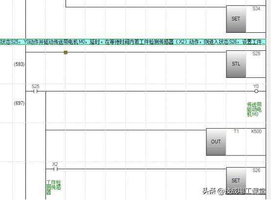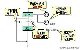 工件补充流程由两个状态组成。初始复位流程结束后即进入状态S25,使Y0动作并驱动传送带电机M0,然后由T1设置8秒的等待时间。
