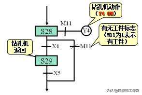 气压冲孔流程由2个状态组成。定位结束直接进入状态S28。当工件标志M11为1时,表示冲孔位置有工件,Y4动作并驱动冲孔机,开始冲孔,直到下限位开关MS0也就是X4动作。
