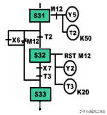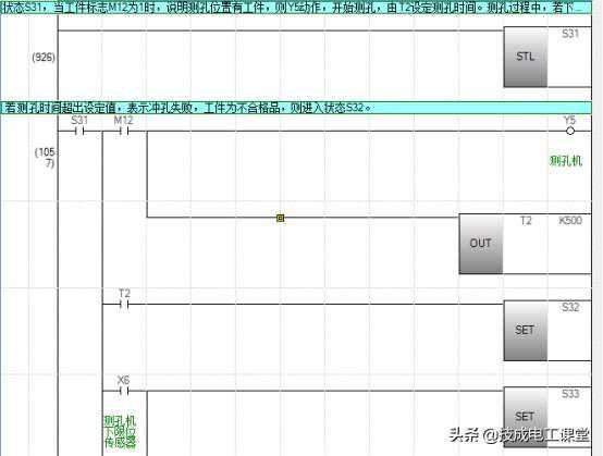 测孔流程由3个状态组成。定位后直接进入状态S31。当工件标志M12为1时,说明测孔位置有工件,则Y5动作,开始测孔,由T2设定5秒测孔时间。测孔过程中,若下限位开关MS2也就是X6动作,表示工件为合格品,进入状态S33,结束测孔流程。