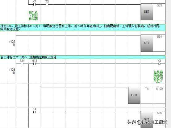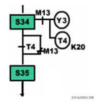 工件搬运流程由2个状态组成。定位后直接进入状态S34。若工件标志M13为1,说明搬运位置有工件,则Y3动作并驱动B缸,抽离隔离板,工件调入包装箱,由T4延时2秒,然后进入状态S35,结束搬运流程。若工件标志M13为0,则直接进入状态S35,结束搬运流程。