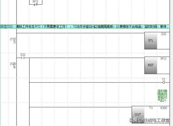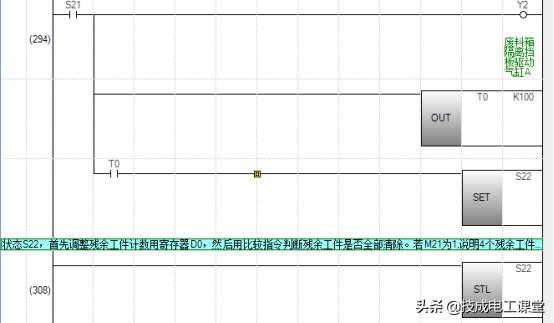 转盘转动过程中,定位传感器PH1(X3)动作瞬间,辅助继电器M0有效,则进入状态S21,使Y2动作,并驱动A缸,抽离废料箱隔离挡板,然后由T0延时2秒。2秒结束,T0的常开触点动作,则进入状态S22,首先调整残余工件计数用寄存器D0,然后用比较指令判断残余工件是否全部清除。