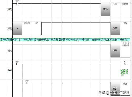 因为只有一个放在工件补充位置的PH0来侦测工件的有无,而另外的钻孔、测孔及搬运位置并没有其他传感装置,那么应如何得知相应位置有无工件呢?本案例所使用的方式是为工件补充、钻孔、测孔及搬运设置4个标志,即M10-M13。当PH0侦测到传送带送来的工件时,则设定M10为1,当转盘转动后,用左移指令将M10-M13左移一个位元,亦即M11为1,钻孔机因此标志为1而动作。其他依此类推,测孔机依标志M12动作、包装搬运依M13动作。