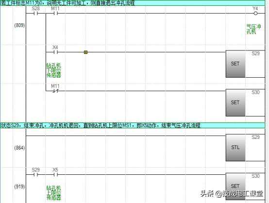 然后进入状态S29,结束冲孔,冲孔机机退回,直到MS1也就是X5动作,结束气压冲孔流程,进入下一工序。在进入S28后,若工件标志M11为0,说明无工件可加工,则直接退出冲孔流程。