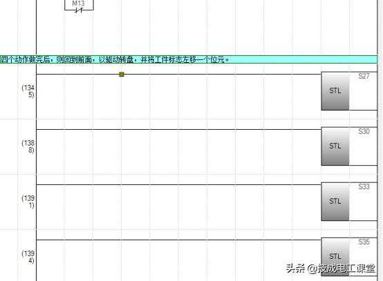 上述四个动作做完后,则回到前面,以驱动转盘,并将工件标志左移一个位元。为了使四项工作能同时进行,且需互相等待,应使用并行性分支与汇合的方式来设计。将5个分流程汇集在一起完成顺序功能图的设计。
