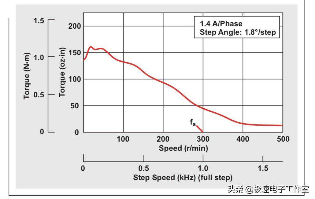 上图是马达公司提供的马达的力矩曲线图,其中fs是一个非常关键的参数,若要正常启动该马达,马达的启动速度必须小于该值,若启动频率大于该值的话,马达会出现堵转或失步等情况。为此,为了达到期望的运转速度,马达以一个较低的频率开始逐渐加速到期望值,一般使用周期性间隔的改变步进电机步进频率即可。