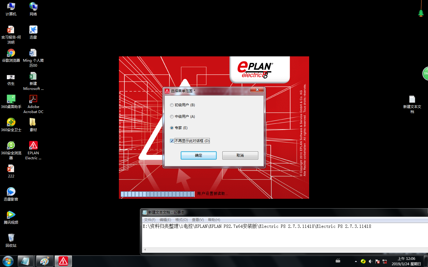截止此步你已完成全部动作,可以进行软件操作。打开桌面图标然后选择EplanP8专业版选项这样功能会更全面,然后在弹出的对话框选择专家级别