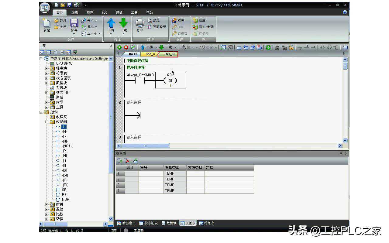 上篇文章中我们介绍了西门子S7-200SMART的中断及中断指令,本篇我们通过一个简单的例子来学习中断指令的使用,并练习编写中断程序,在的上升沿通过中断使立即置位,在的下降沿通过中断使立即复位。我们来编写程序,启动STEP7-Micro/WINSMART创建一个新项目,创建新项目后首先编写处理上升沿事件的中断程序,在指令树的位逻辑中拖放一个常开触点到中断程序INT_0,输入地址,再拖放一个立即置位指令,输入地址,置位个数为1。