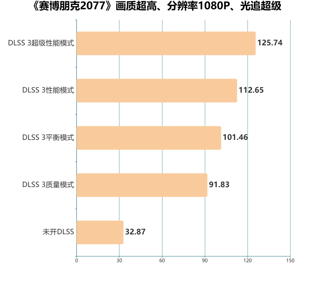 我们可以通过图表清晰看出DLSS3加持下给游戏的光追带来了多大的影响。DLSS3的质量模式就提升至近3倍的性能,DLSS3超级性能模式更是提升至接近4倍。