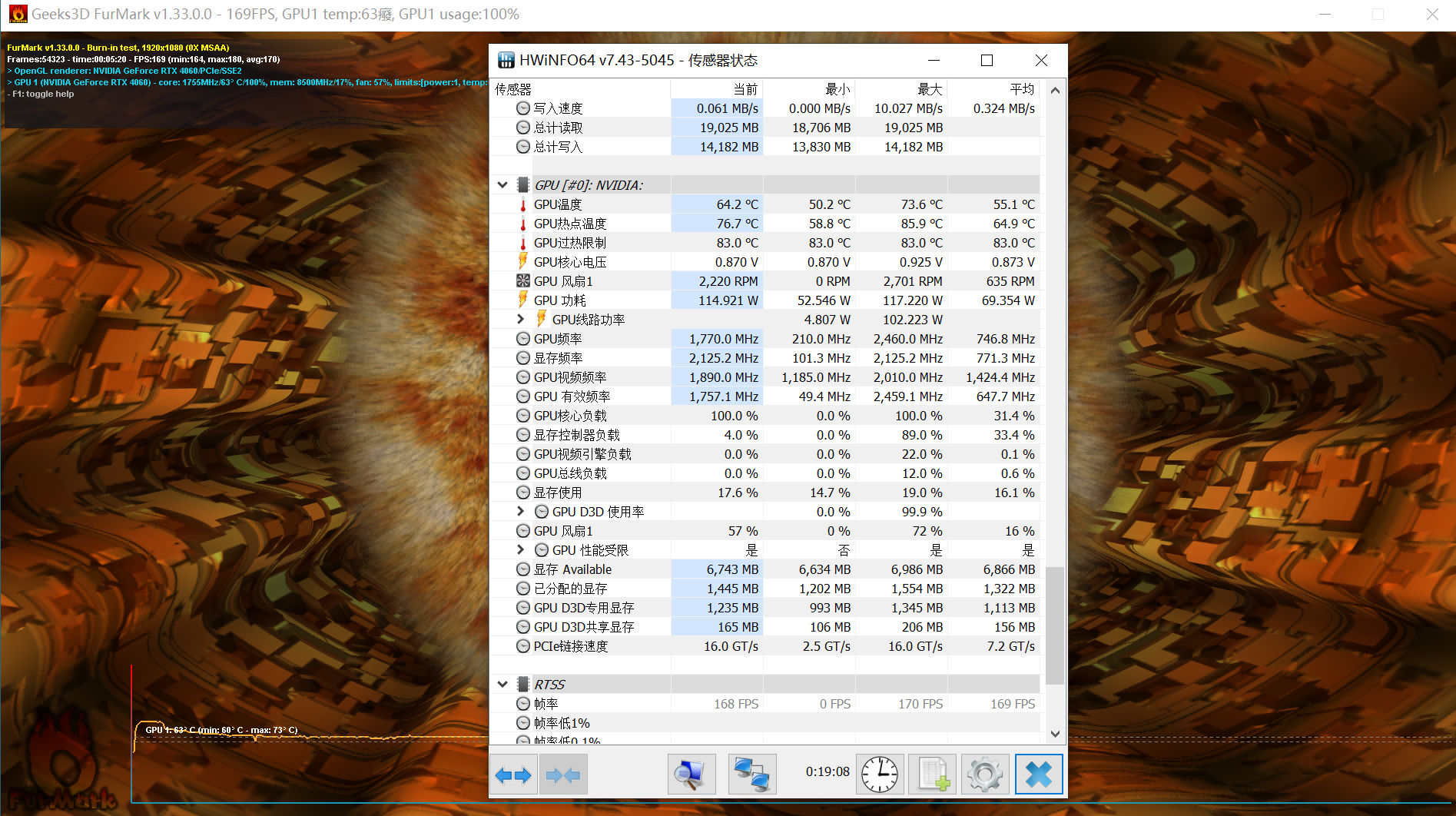 由于RTX4060功耗非常低,烤机温度我们大可放心。使用FurMark烤机10分钟左右后,这张显卡的核心温度长时间稳定在64.2℃左右,显存频率为2125.2MHz。