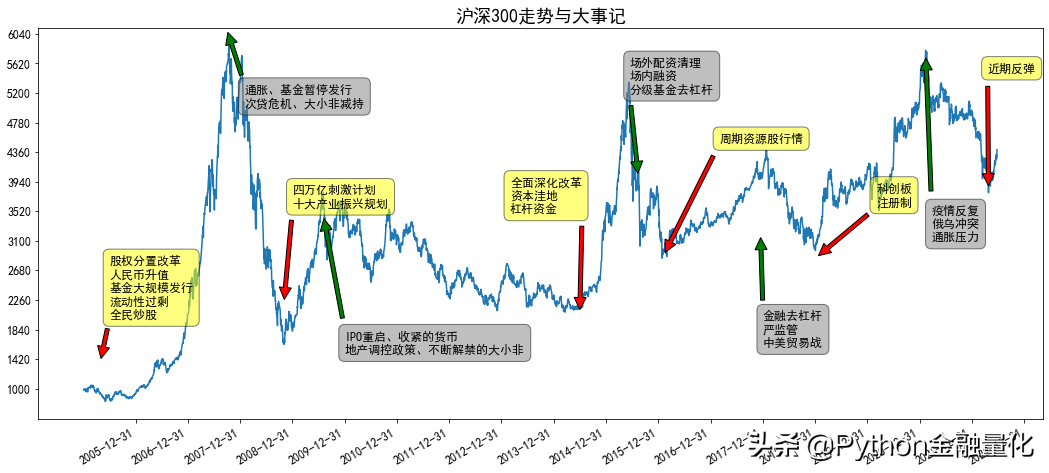 所谓“不谋全局者,不足谋一域”,天天盯盘的人容易只见树木不见森林,在股市每天的涨涨跌跌中迷失方向。要想在大波动里捕捉机会,还得适时跳出市场,站在全局的视角去分析和把握当前行情所处的阶段。本文以沪深300指数为例,对历史行情进行探索性分析,同时借助时间序列的相似性、动态规整分析,分析股市牛熊兴替的规律,考察当前行情所处的历史阶段,为整体把握和量化分析市场提供参考。每一次大的行情,如05-07大牛市、08年金融危机、15年股灾等都伴随着一定的历史背景(如下图所示),感兴趣的读者可结合事件驱动深入挖掘。