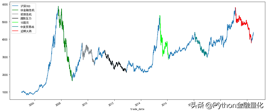 dates=md_df[['起始日期','结束日期']].valuesevents=['08金融危机','欧债危机','通胀压力','15股灾','中美贸易战','近期大跌']colors=['green','gray','black','lime','teal','red'](figsize=(16,7))()foriinrange(len(dates)):data[dates[i][0]:dates[i][1]].plot(c=colors[i],label=events[i]);();
