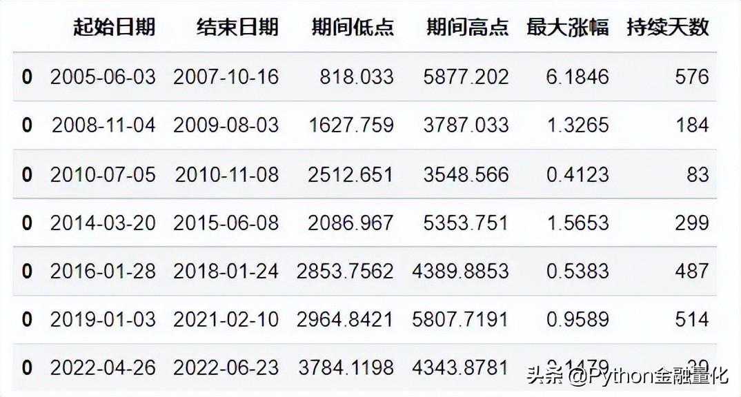 下面通过编程获取某段时间期间指数的最大回撤和最大涨幅,以及持续时间。该部分代码较长,此处省略,完整代码见知识星球。