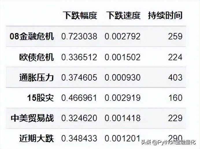 defget_time_series(data,dates):data_list=[]foriinrange(len(dates)):d0=dates[i][0]d1=dates[i][1]dd=data[d0:d1]_index(drop=True,inplace=True)data_(list(dd/[0]))returndata_listdefcal_similiarty(data,dates,events):df_temp=(get_time_series(data,dates)).Tdf=()name='下跌'if'危机'in''.join(events)else'上涨'df[name+'幅度']=df_(lambdax:abs(x-1).dropna().max())df[name+'速度']=df_(lambdax:abs(x-1).dropna().max()/len(()))df['持续时间']=df_(lambdax:len(()))=eventsreturndf
