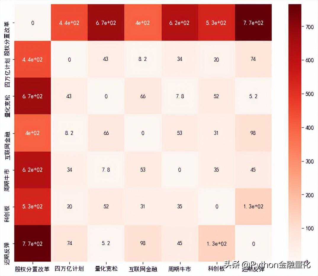 defcalc_dtw(l_sr):dict_dtw={}foritem1,(l_sr,repeat=2):distance,path=fastdtw(item1[1],item2[1])dict_dtw[(item1[0],item2[0])]=distancereturndict_dtwdefplot_dtw(data,dates,events):data_list=get_time_series(data,dates)dict_dtw=calc_dtw(list(zip(events,data_list)))size=len(events)dist_matrix=(list(dict_())).reshape(size,size)df_dist_matrix=(data=dist_matrix,index=events,columns=events)(figsize=(10,8))color='Greens'if'危机'in''.join(events)else'Reds'(df_dist_matrix,square=True,annot=True,cmap=color)()
