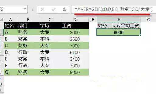 F2公式:=AVERAGEIFS(D:D,B:B,"财务",C:C,"大专")