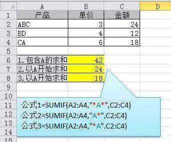 说明:如果需要进行模糊求和,就需要掌握通配符的使用,其中星号是表示任意多个字符,如"*A*"就表示a前和后有任意多个字符,即包含A。