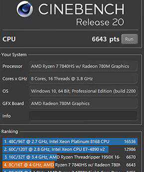 我们先看一下R7-7840HS的性能表现。在CinebenchR20的测试中,R7-7840HS的多核心成绩是6643pts,这个成绩非常夸张,已经快追平第一代线程撕裂者1950X了,后者可是一颗16核心32线程处理器。这样的性能表现对于一台迷你主机来说,非常恐怖。