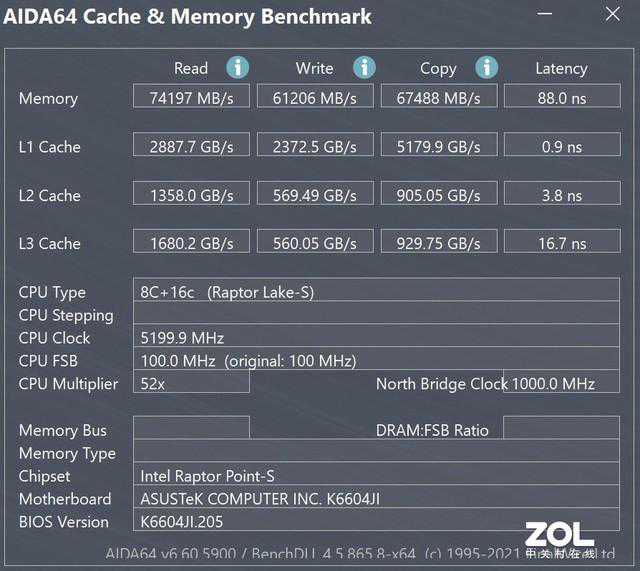 先看32GBDDR55600内存,实测内存的性能还是挺不错的,读取速度达到74197MB/s,写入速度61206MB/s,拷贝速度67488MB/s,延迟控制在了88ns。