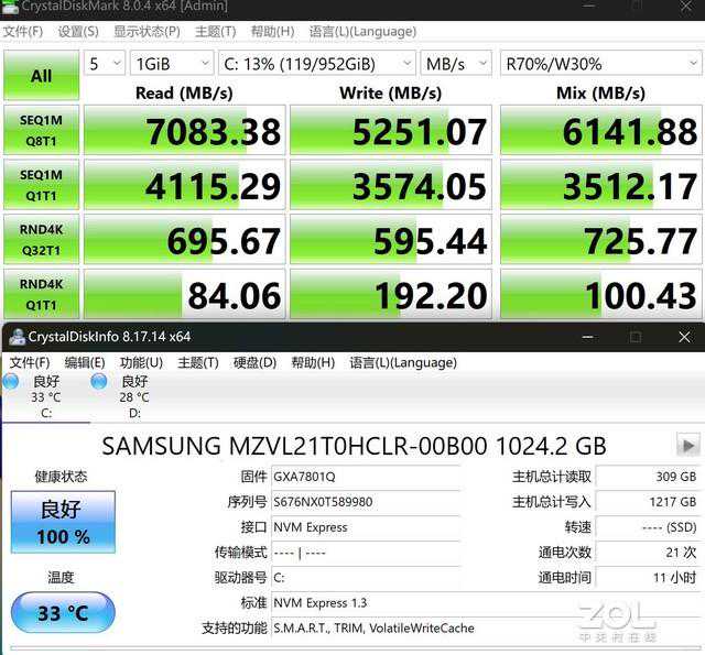 在看一下1,实测Q8T1顺序读取速度7083.38MB/s,写入速度5251.07MB/s,4KQ1T1随机读取速度为84.06MB/s,写入速度为192.2MB/s。