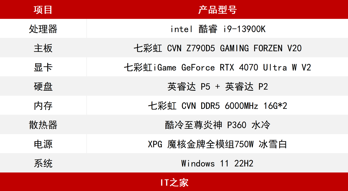 IT之家也是提前收到了七彩虹iGameGeForceRTX4070UltraWV2,在本次测试中,我们将使用一套高配intel配置来测试,尽量避免显卡瓶颈。具体配置如下: