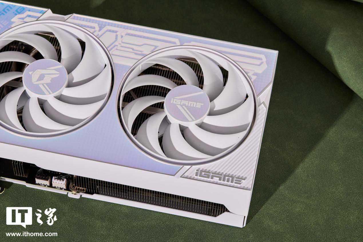 iGameGeForceRTX4070UltraWV2显卡采用了三风扇设计,每个风扇由9片白色的环形扇叶组成,中间点缀着蓝白色的Logo。显卡四周装有一圈金属包边,突出了其硬朗的外观风格。这款显卡配备了豪华的散热模组,可以轻松应对仅200W的RTX4070显卡的散热需求。