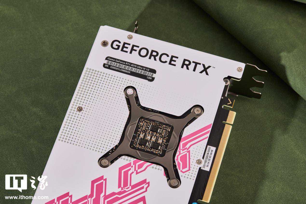 iGameGeForceRTX4070UltraWV2显卡的背板主体呈现白色,饰以粉色的UltraLogo,色彩鲜艳夺目。