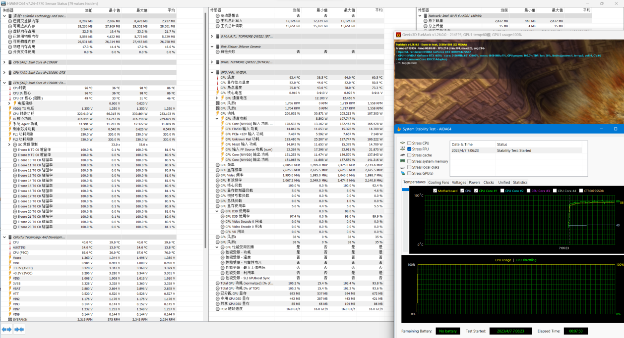 RTX4070的功耗会很低,之前就早有耳闻。具体能有多低呢?接下来我们进行理论性能测试环节。首先是单烤甜甜圈,烤机15分钟后,核心温度稳定在62.4℃左右,显存温度仅75.8℃。整卡功耗仅仅200W,不得不说这个功耗真的是相当的低,如果电源不虚标,CPU配个i5、R5之类的百瓦CPU,只要450W的电源都能带动整机了。最关键的是,它仅需单根8Pin一分二输出线就可以正常使用,这意味着有升级想法的玩家们,完全不需要换电源。