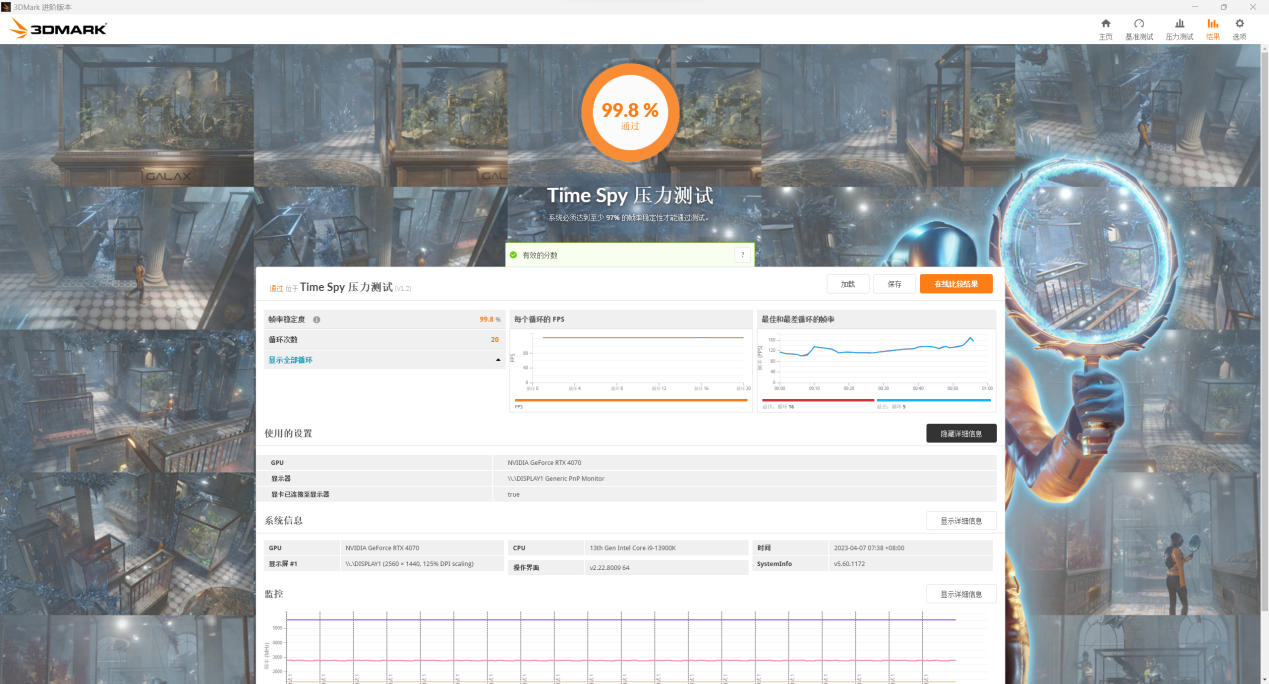 接下来进行3DMark压力测试,这个测试可以检测连续跑分下显卡性能有没有发生下降,一般97%以上才算合格的显卡。实测七彩虹iGameGeForceRTX4070UltraWV2的得分为99.8%,性能释放极其稳定,风扇噪音非常低。