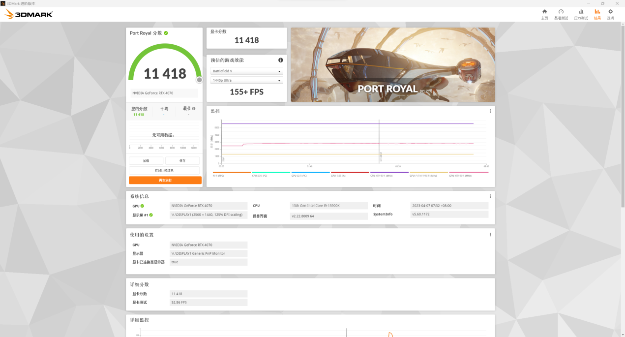 而在3DMarkPortalRoyal光追测试中,七彩虹iGameGeForceRTX4070UltraWV2获得了11418分,说明其光追能力介于RTX308010G和RTX308012G之间,足以满足2K光追游戏的需求。