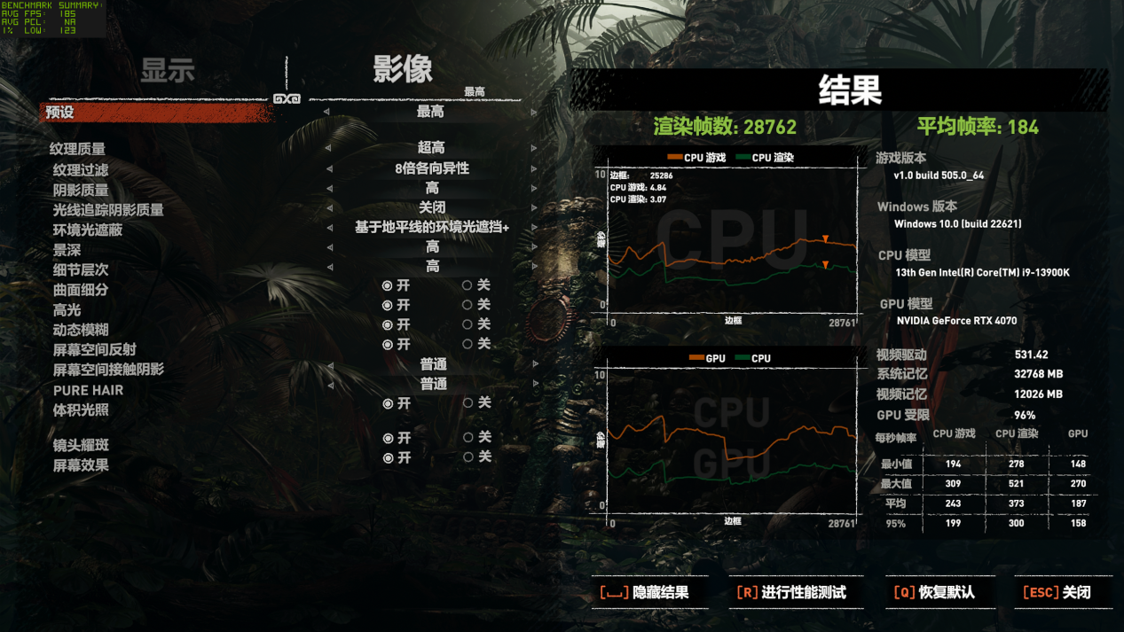 在另一款经典的3A大作《古墓丽影:暗影》中,我们也得到了类似的答案。在2K最高画质下运行自带的BenchMark,已经能达到平均184帧,满足2K165Hz屏幕的畅玩。
