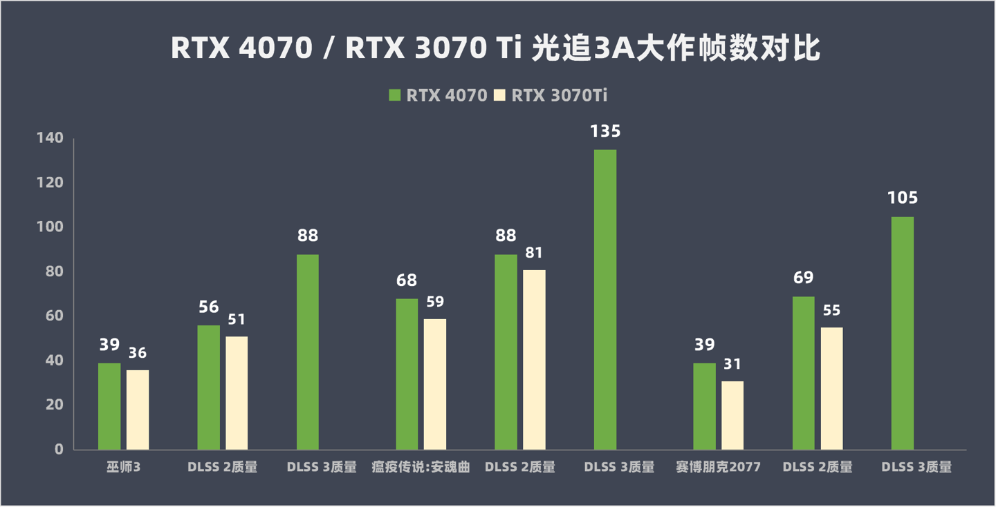 笔者也顺便用这套配置换上RTX3070Ti测试了一套数据,看看隔代之间性能会有多少提升,在DLSS3技术的加持下又会有多少提升。实测下来帧数表现是相当喜人的。在不开启DLSS3的情况下,RTX4070大约有10%的帧数优势。如果开启RTX4070系列独占的DLSS3技术,帧数几乎实现了2-2.5倍的增长,与RTX3070Ti实现了质的差距。