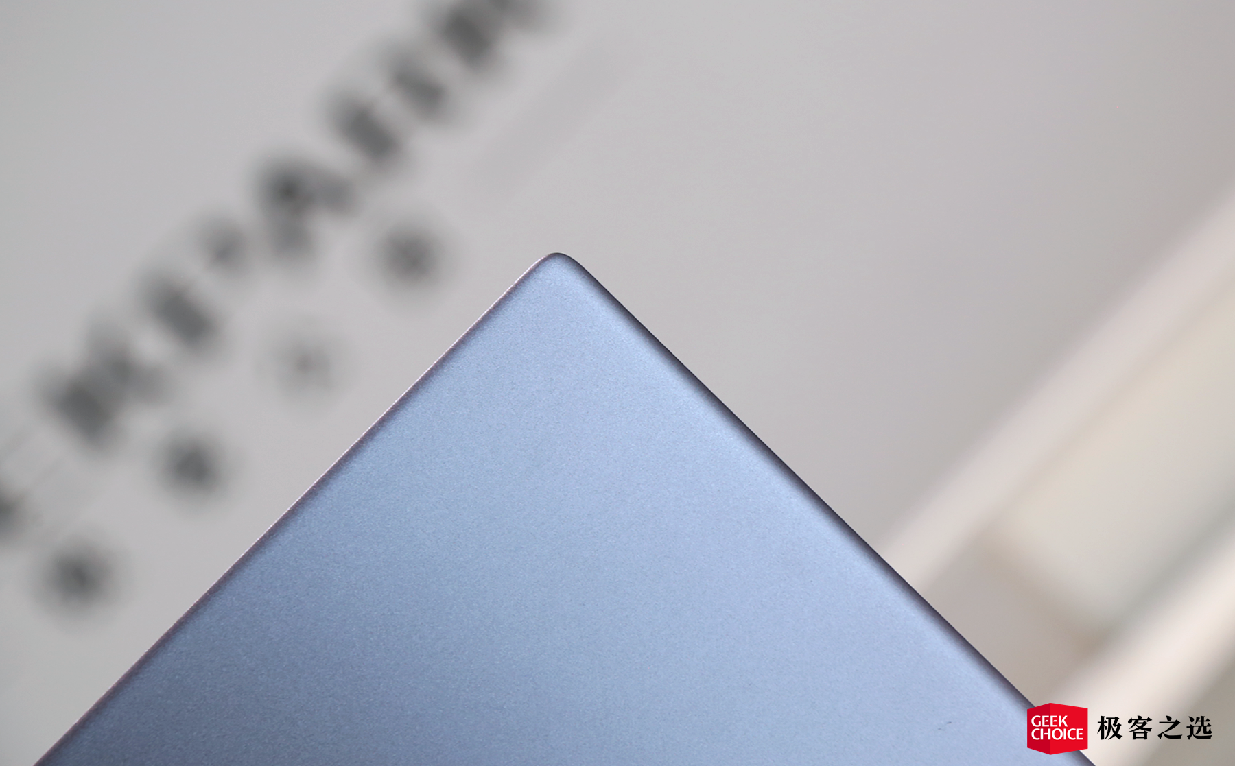 细节部分有两个值得说的点。首先它的顶盖采用了喷砂工艺处理,摸上去手感很细腻,同时具备不错的抗指纹能力,后期打理起来比较方便;另外很有意思的地方,是它在机身左上角做了亮面切割,这种非对称设计看上去还是挺特别的。