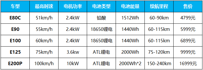 对于不同动力和续航需求,九号电动E系列提供了丰富的产品序列,其命名方式参照了燃油摩托车以排量数字标识为产品型号的方式。根据尾标数字大小,九号电车E系列共有包括E80C、E90、E100、E125和E200P五种型号。
