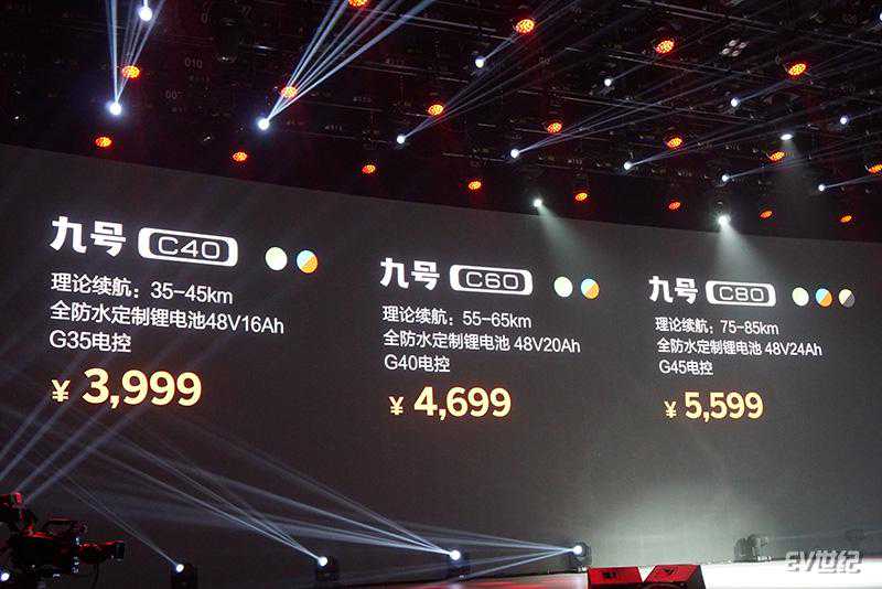 九号电动C按标配电池规格共有三个版本,分别是C40、C60和C80,售价分别是3999元、4699元、5599元,其中,顶配车型的C80续航里程为75~85km,C40和C60续航分别为35~45km和55~65km。三个版本均配备48V无刷电机,额定功率400w,峰值扭矩54N•m,最高时速25km/h(国标规范),整车重量小于55kg。