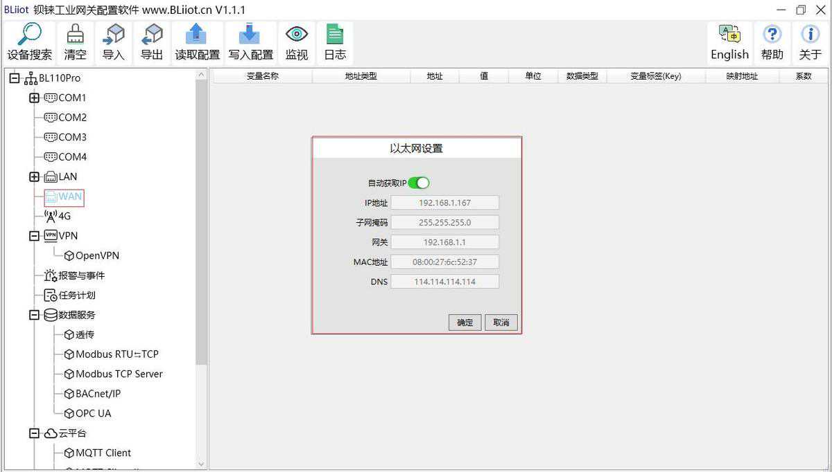 注意:WAN口的IP地址是规定WAN口设备是哪个网段的IP地址,如果WAN口设备IP地址不是WAN设置的网段IP,WAN口采集不了,要根据需求是更改WAN口IP还是更改WAN口设备的IP地址。更改网关的IP地址都要写入配置后,断电重启才能生效。