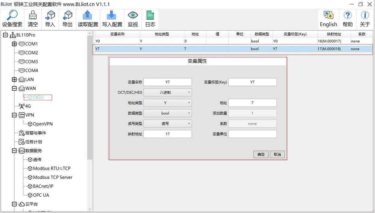 本示例采集FX5U的寄存器Y的部分数据配置如下: