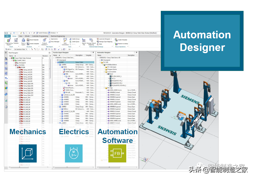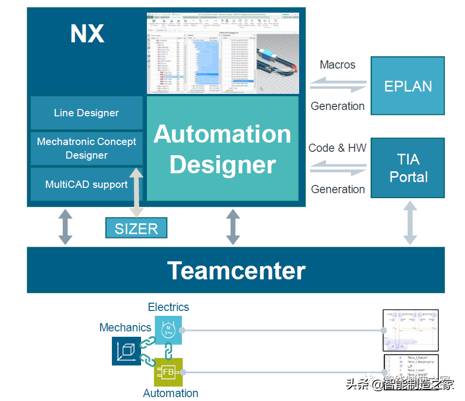 通过AutomationDesigner(这是集成在NX中的某项工具应用),可以实现机械(NX机械设计工具)、电气(EPALN)和自动化软件(TIAPortal)之间的集成
