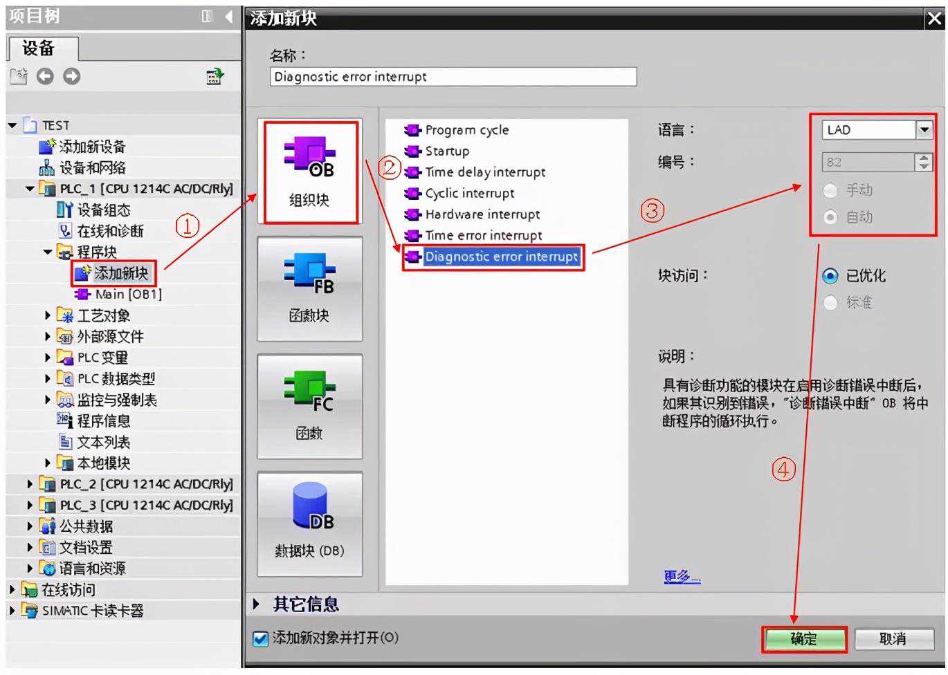 (1)按如下步骤创建诊断错误OB82。如下图所示: