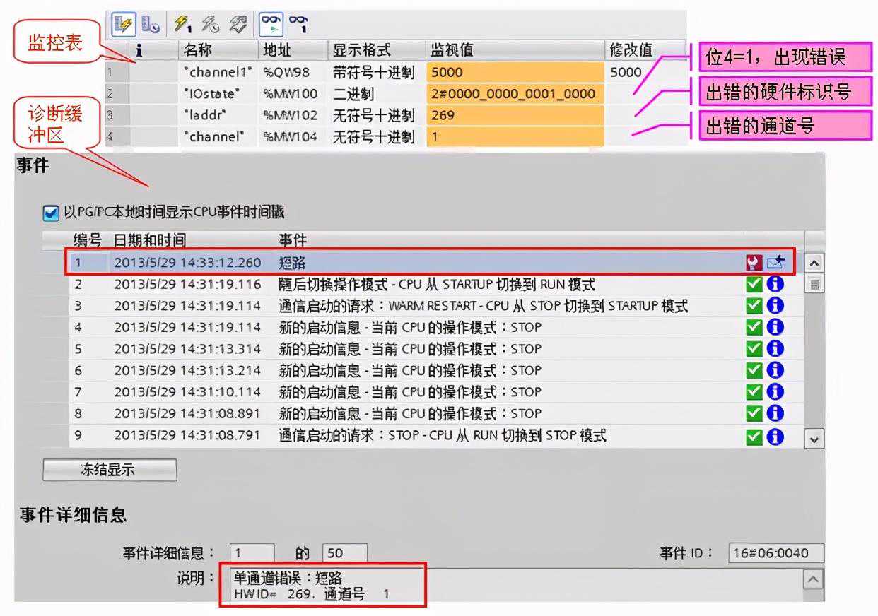 (4)测试结果:程序下载后,在监控表中给“channel1”设置输出值5000,如果此时出现了短路故障,则将立即触发诊断错误功能。如下图所示: