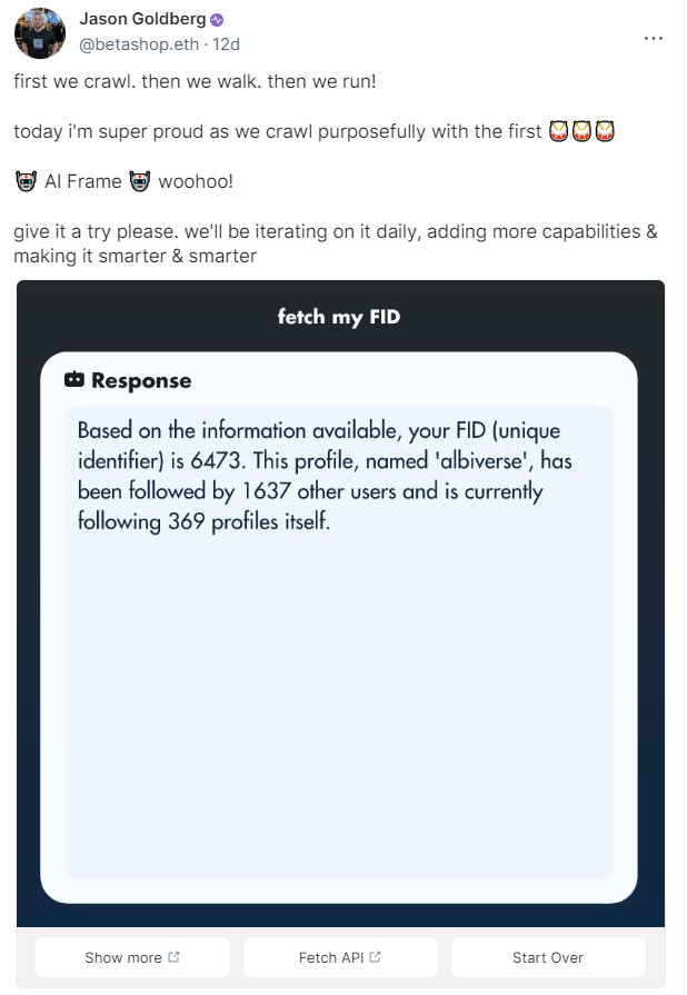 在《为什么FarcasterFrames如此重要》中,AntonioGarcia解释说:“Frames就像另一个应用程序的门户一样打开,允许其他应用程序直接访问用户。从Web2的角度来看,它似乎与网站通常打开到Web的另一部分的