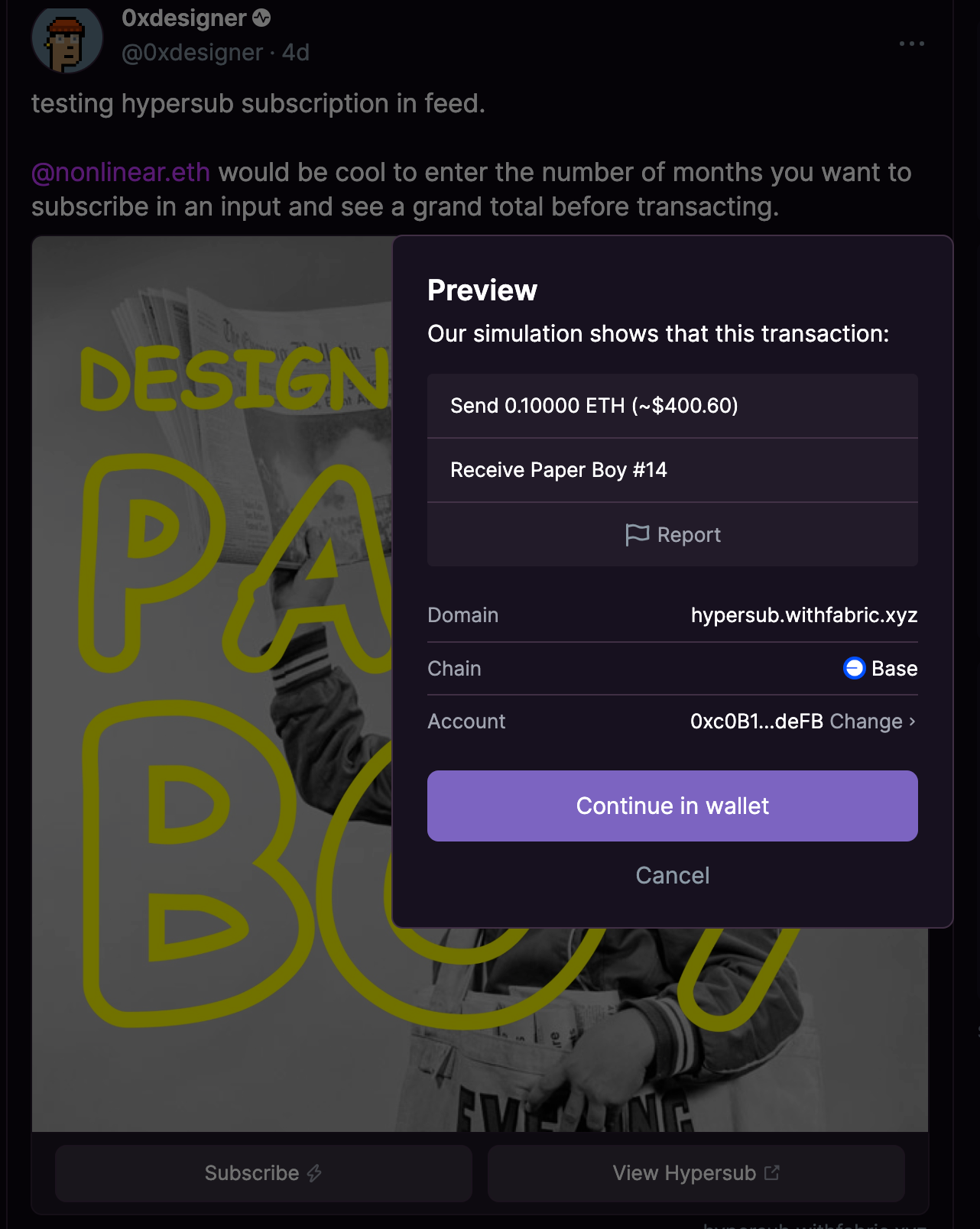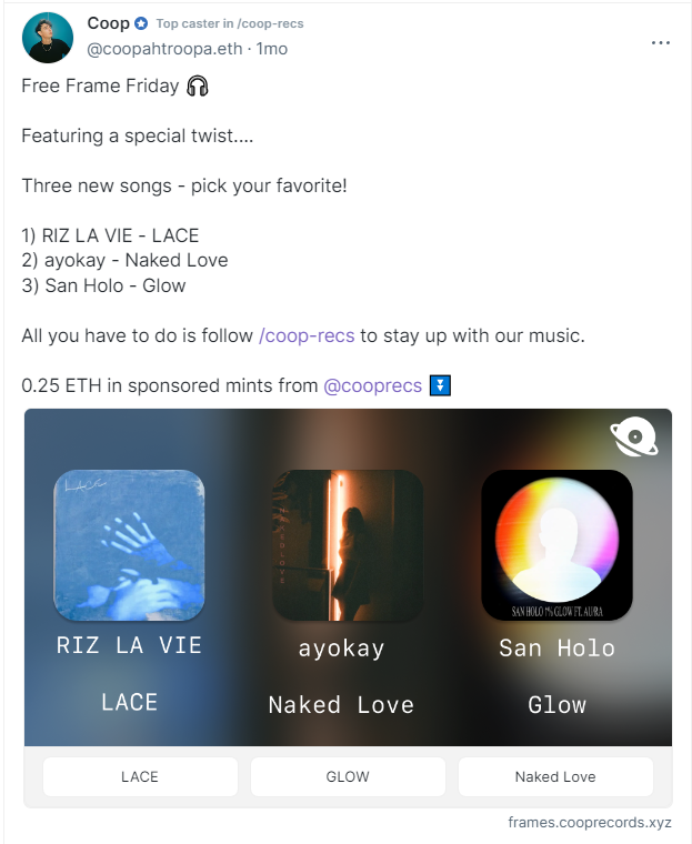 。mint允许用户通过Frames一键铸造NFT。此时,大多数情况下,铸币费用都会在后端得到补贴。另一种选择是让用户使用Warp(Warpcast内部货币)来支付铸币费用。