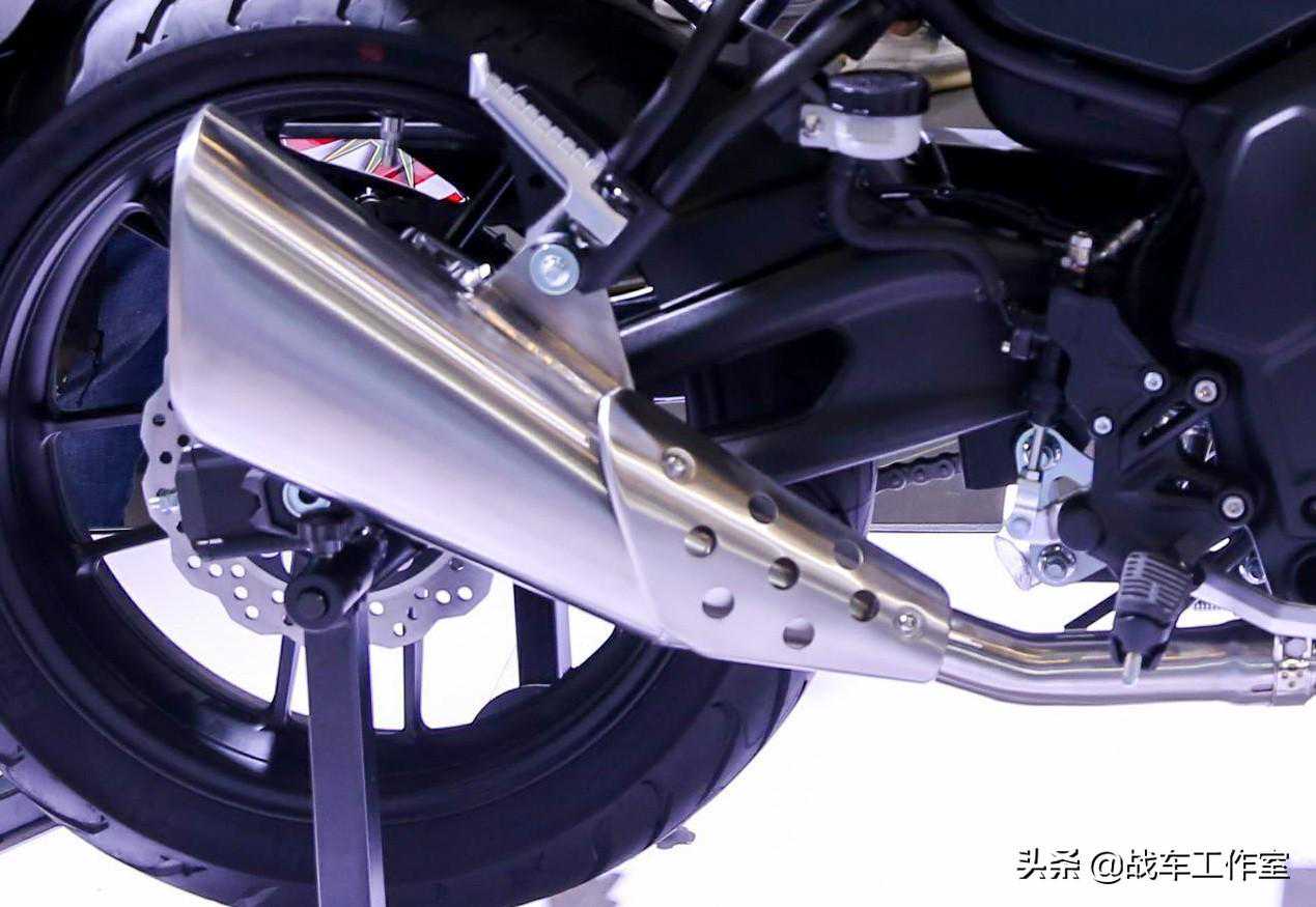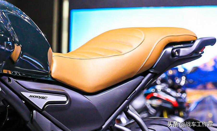 油箱下方靠前的装饰壳,算是AC500设计亮点。可以很好的遮挡车架加强筋的留白,还能遮挡好几个焊接点。这样,从侧面看整车时候,这块壳子很好的补足了油箱前方倾斜下坠的线条。让车头的动线下降,也让车头变得饱满。