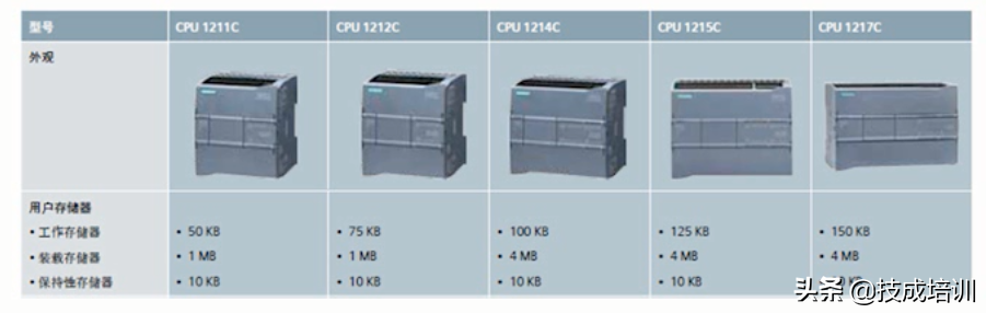 其次,再看看存储器大小方面。S7-200的存储器分为数据存储器盒程序存储器,不同型号的CPU,存储器的大小不一样。而S7-1300的存储器分为工作存储器。装载存储器盒保持性存储器这三种。除了保持性存储器外,不同型号的CPU所支持的存储器的大小是不同的。
