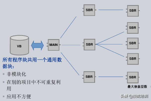 S7-200的程序结构,所有的程序块共用一个通用数据块,它的特点是非模块化,在别的项目中不可重复利用,不太方便。