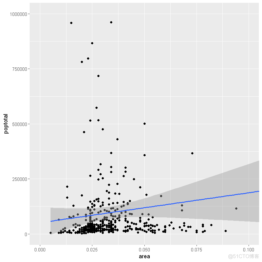 g-ggplot(midwest,aes(x=area,y=poptotal))+geom_point()+设置se=FALSE来关闭置信区间geom_smooth(method="lm",se=TRUE)plot(g)
