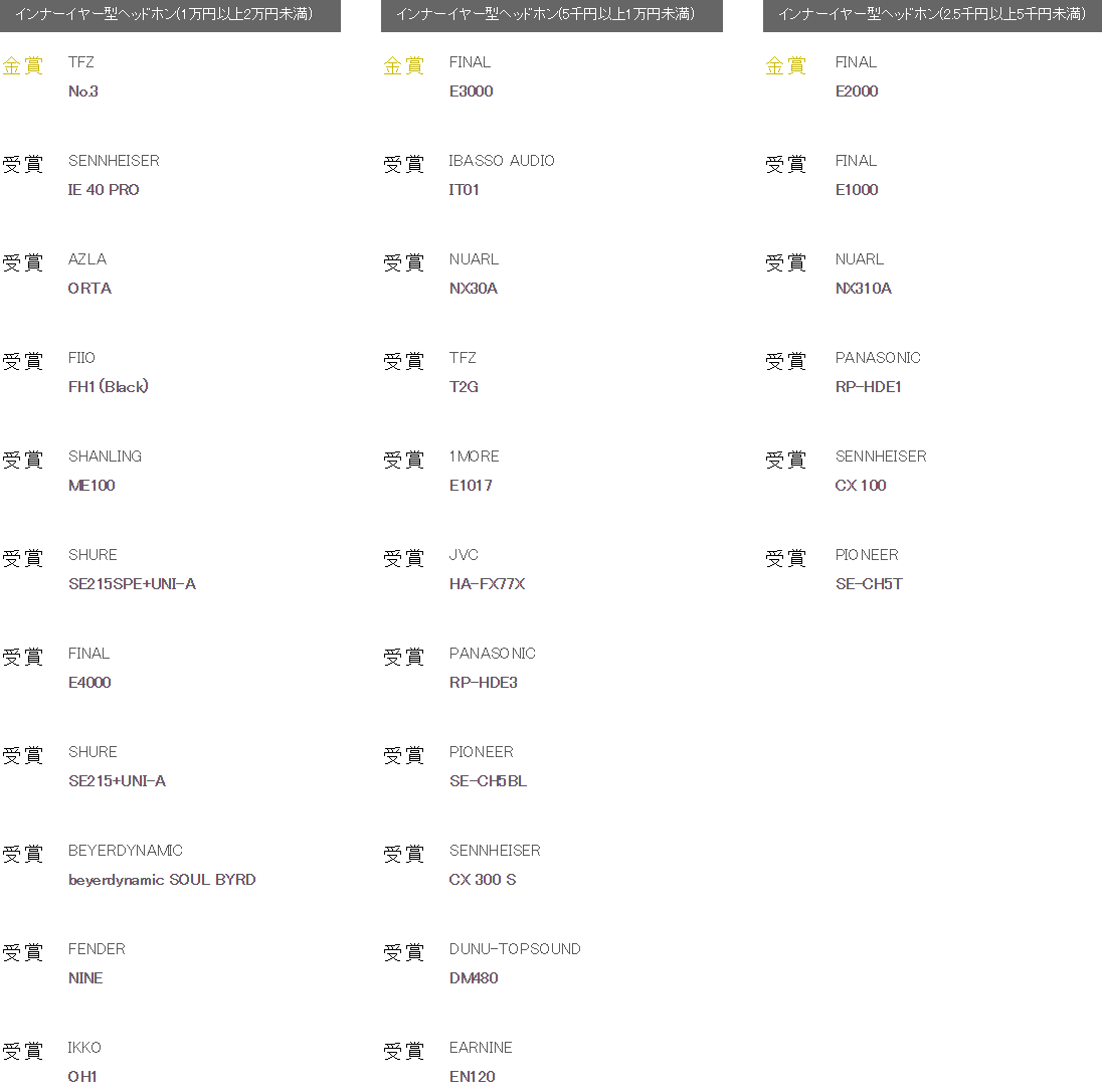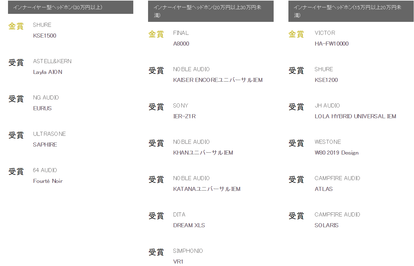 值得一提的是在3万円以上5万円未満(人民币1800元到3000元之间),国内音频品牌有多达四款耳机斩获VGP奖项,分别是低调实力派的飞傲FA7J(日本版)、FH5(黑色)、轻奢高级感的山灵ME500(国内销售很强势)、纯正发烧级的达音科DK3001PRO(几乎是3000档耳塞中最具性价比和声价比的那个),在此,person也恭喜这些国产高端耳机在日本市场取得的成就,愿再接再厉!