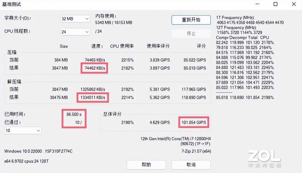 压缩与解压缩在日常办公应用中会频繁涉及,不只是打包与解包,几乎所有软件后台运行都会做压缩与解压缩的工作。通过7-Zip测试可以看到,完成10轮测试耗时86.5秒,压缩速度达到74462KB/s,解压缩速度达到1334011KB/s,总体评分为101.854GIPS,压缩与解压缩性能优异。