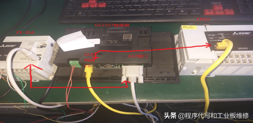 GS2107-WTB触摸屏同时控制两台三菱设备GS2107-WTB同时控制FX5U和FX3SA设备目录一、硬件连接二、触摸屏设置和画面制作三、程序编写一、硬件连接1)整体硬件连接二、触摸屏设置和画面制......