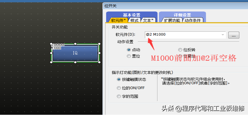 2)FX5U程序,只要触摸屏触摸一下"IQ",M1000即为"1"。